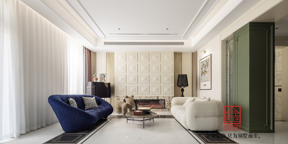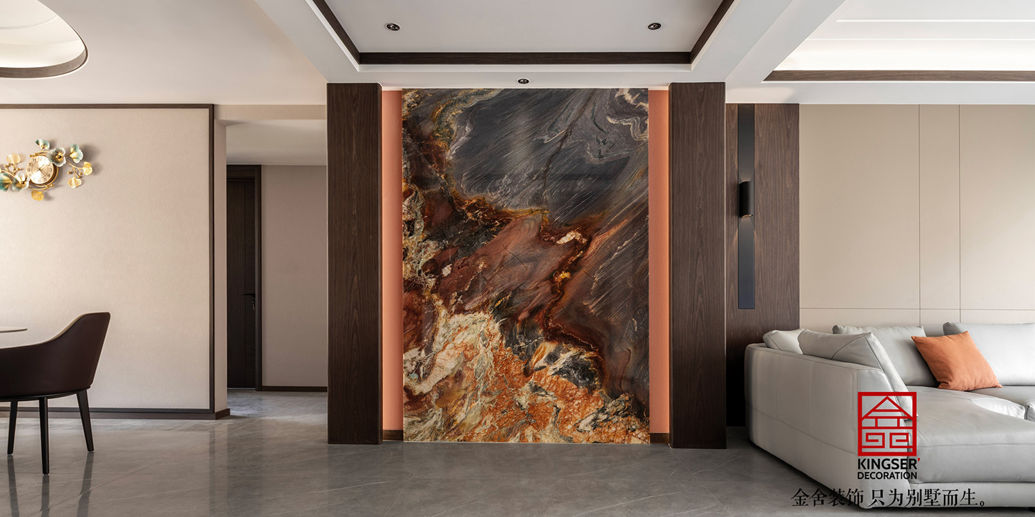 褪去城市繁冗華麗的外殼,回歸至與人的內(nèi)在共鳴,斑駁的光影在客廳空間徜徉,大理石與墻板的搭配,釋放出一種優(yōu)雅、沉靜及治愈的氛圍感,貫穿于整個別墅裝修空間的動線。
